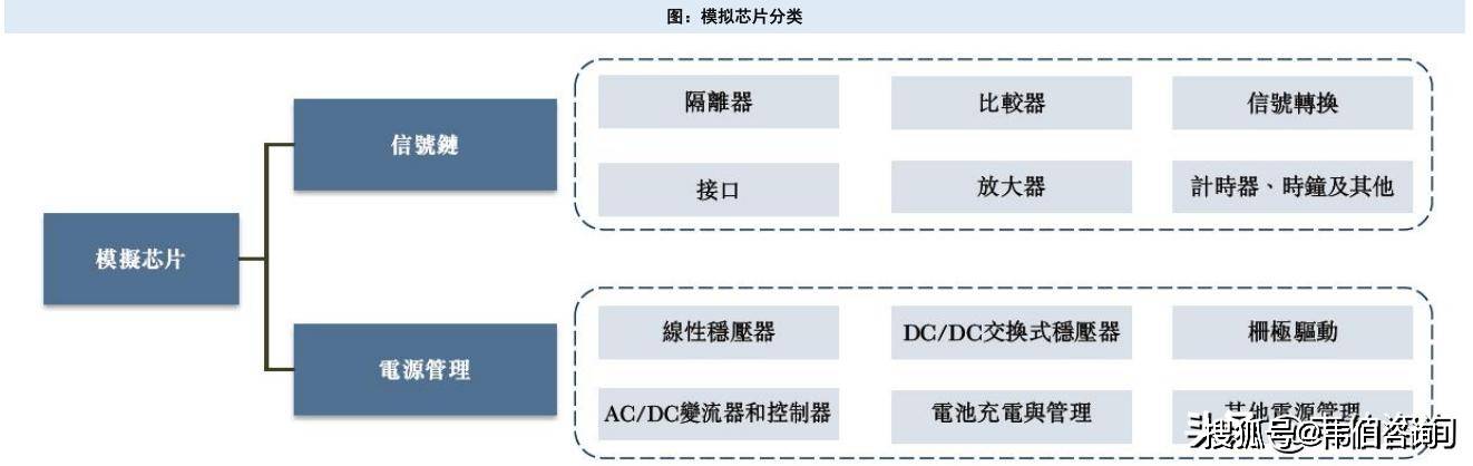 模拟芯片主要是指由电阻、电容、晶体管等组成的模拟电路集成在一起用来处理连续函数形式模拟信号(如声音、光线、温度等)的集成电路,包括电源管理芯片、信号链芯片(含射频芯片)等;数字芯片对离散的数字信号进行算术和逻辑运算的集成电路,其基本组成单位为逻辑门电路,包括逻辑芯片、存储芯片、微控制芯片等。