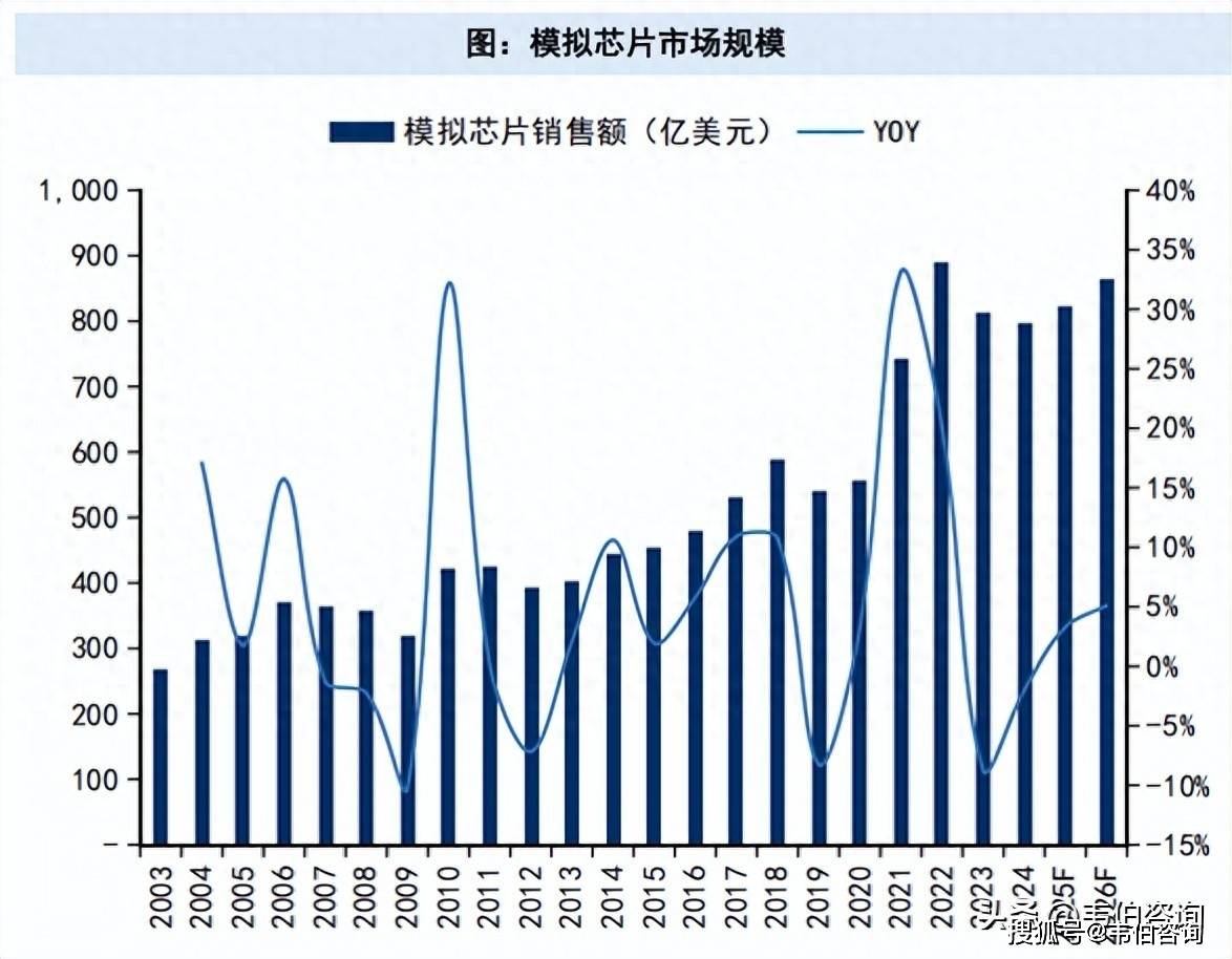 其中模拟芯片分别增长3.3%/5.1%至822/864亿美元