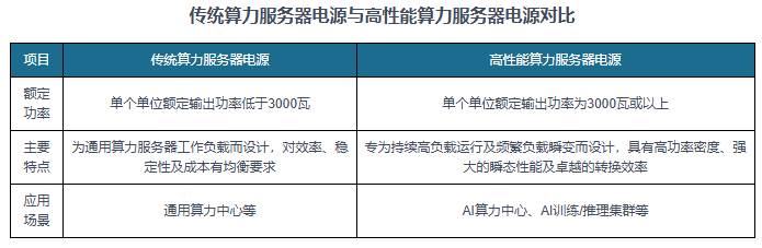 当前,我国算力服务器电源市场仍以传统算力服务器电源为主。但随着AI训练、推理等需求持续攀升,智能算力规模不断扩大,下游对算力服务器系统的供电能力以及电源输出功率、转换效率、功率密度和运行可靠性均提出了更高要求,传统算力服务器电源已难以适配这一市场需求。在此背景下,高性能算力服务器电源因专为持续高负载运行、频繁负载瞬变场景设计,兼具高功率密度、优异瞬态性能与卓越转换效率,可充分满足功率密度、能源效率及保护功能的严格要求,为AI算力中心稳定运行提供坚实供电保障,行业迎来发展风口。